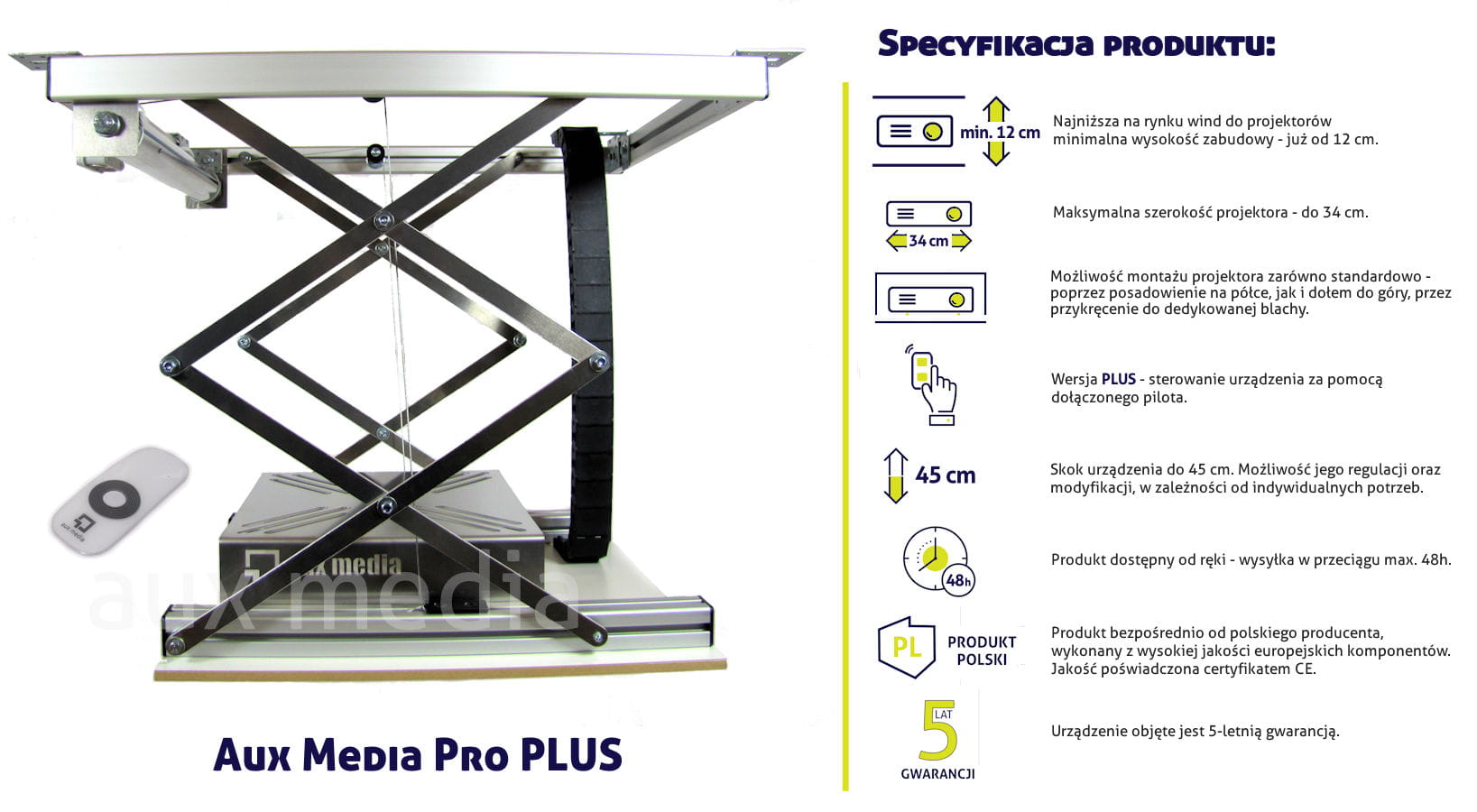 Winda do projektora Aux Media Pro PLUS to kompaktowe i estetyczne rozwiązanie do instalacji kina domowego oraz profesjonalnych systemów AV. Urządzenie charakteryzuje się cichą i precyzyjną pracą, która eliminuje konieczność każdorazowej kalibracji ustawień projektora. Dzięki lekkiej konstrukcji z anodowanego aluminium winda doskonale integruje się z sufitem, pozostając praktycznie niewidoczna, gdy nie jest używana.